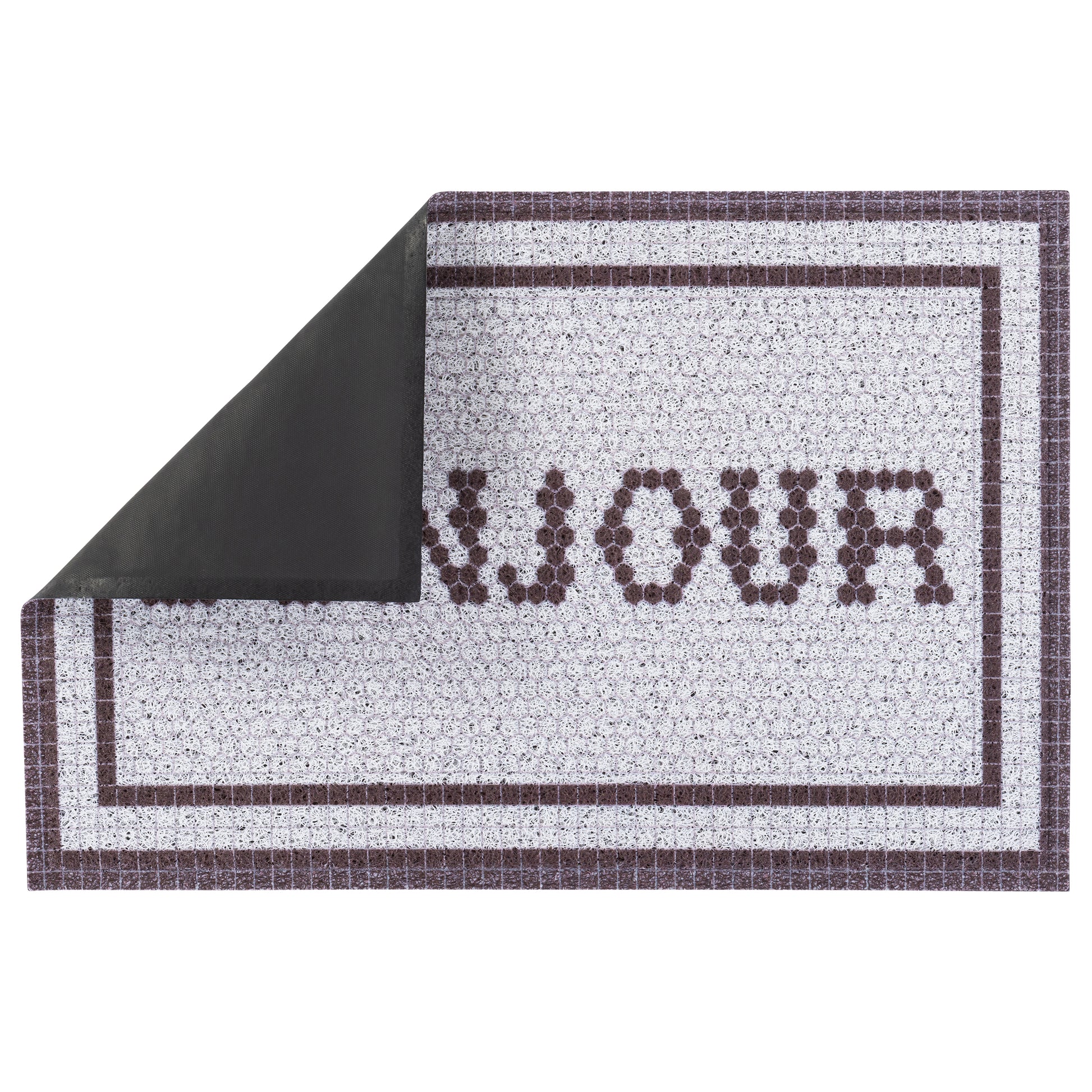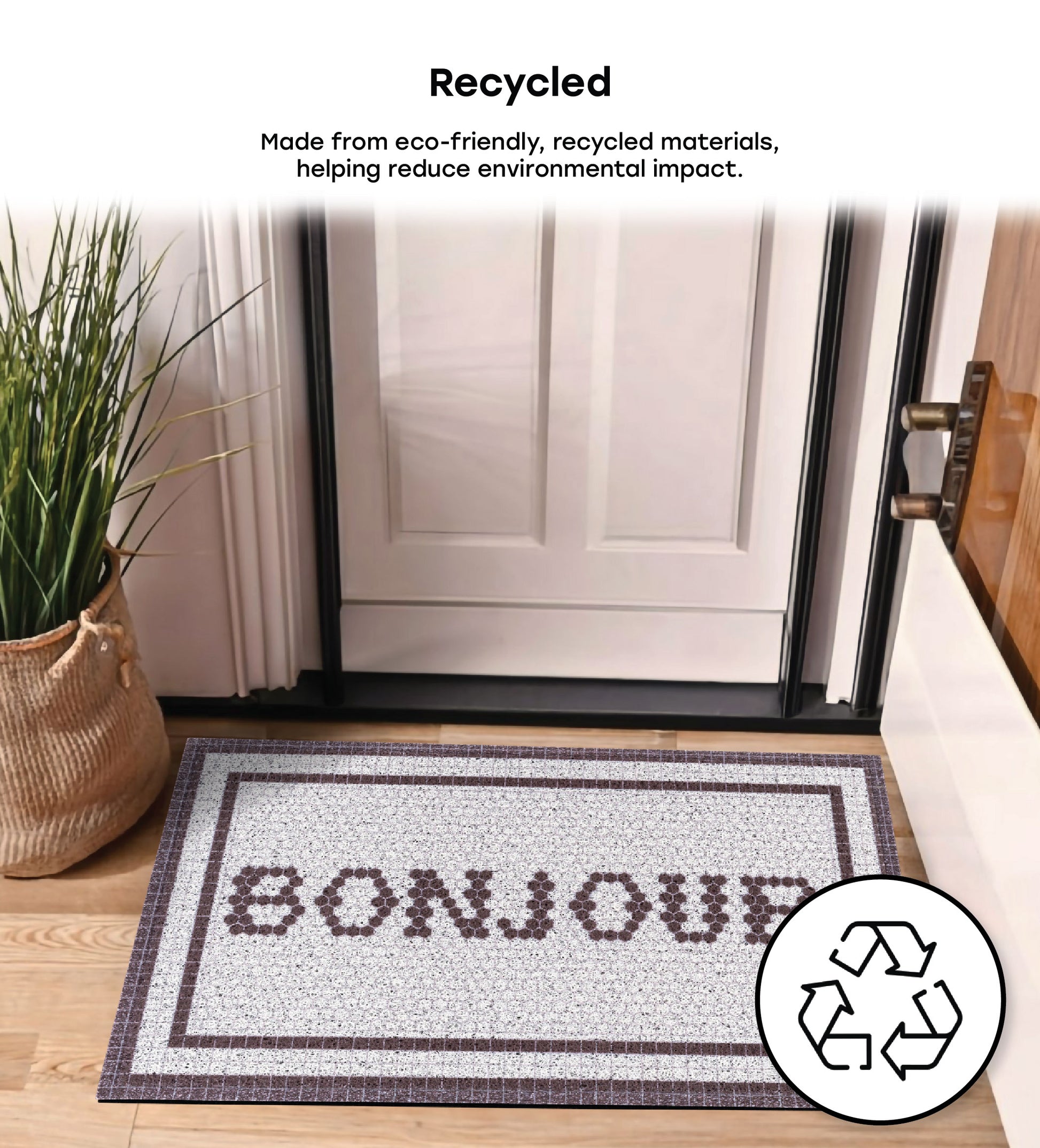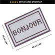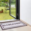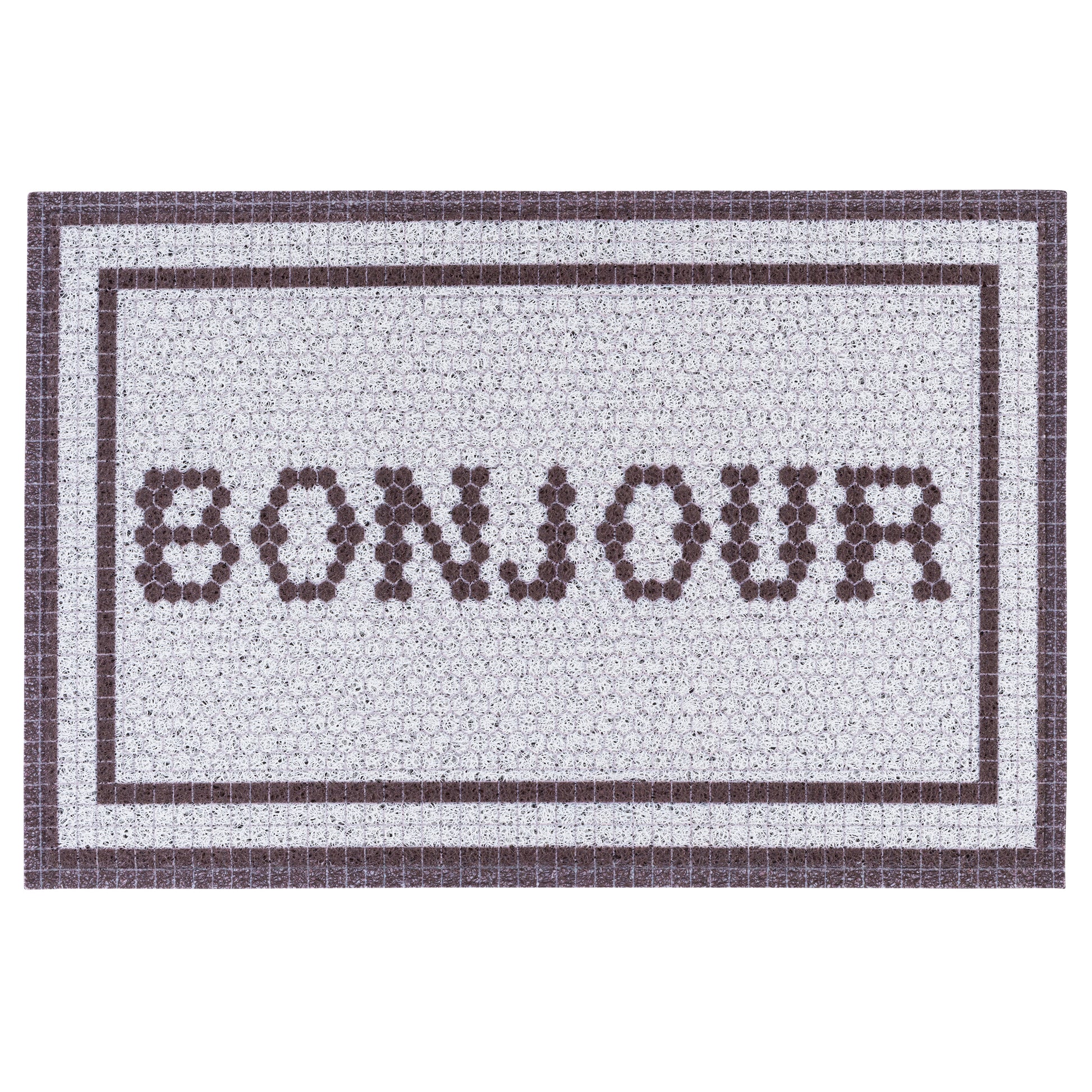 Our Matologie Easy Clean Indoor-Outdoor Doormat effortlessly combines style and function. Crafted from recycled materials, this Grey Bonjour Noodle Doormat features a subtle light grey background with a Bonjour Text design with deep brown double border, adding simplicity to any entryway.