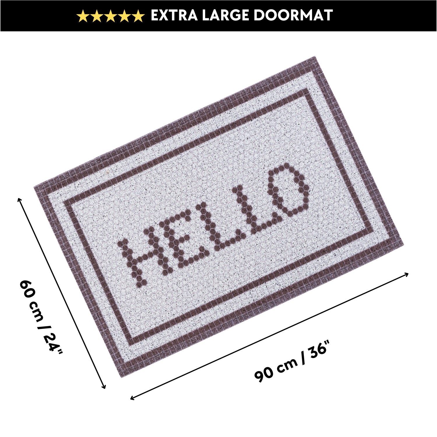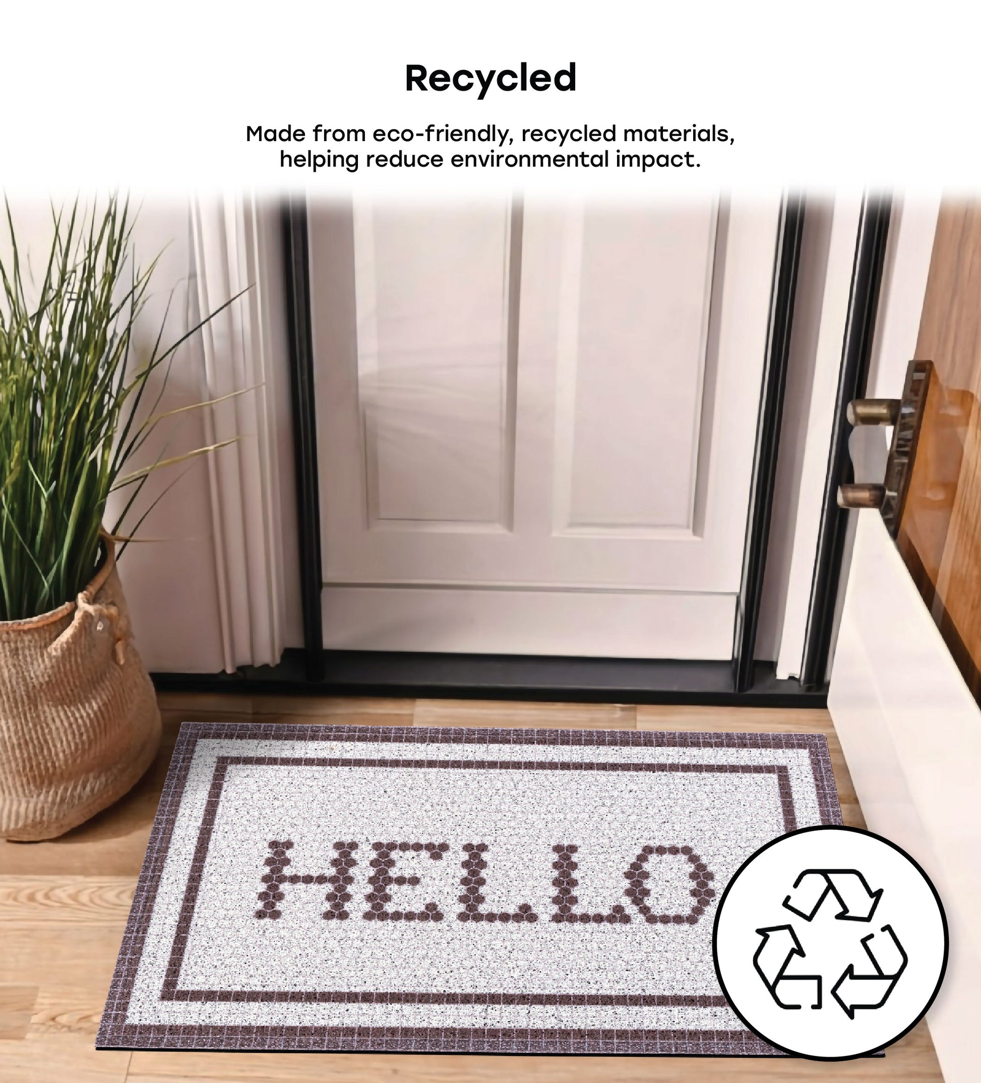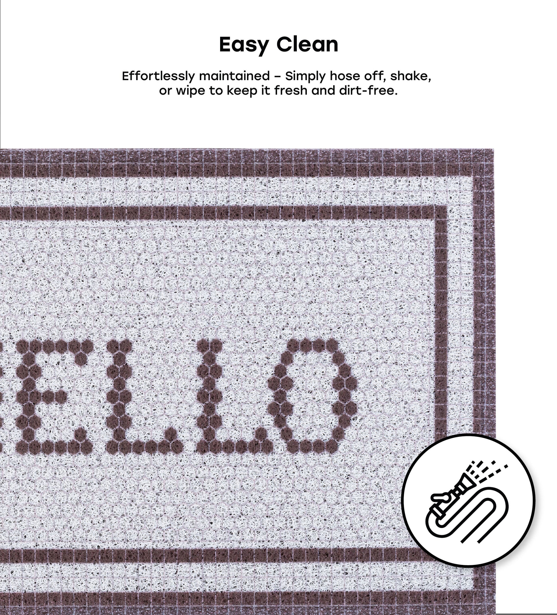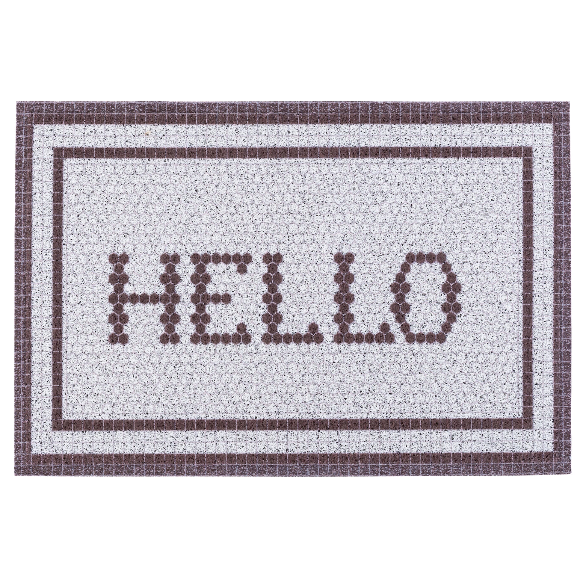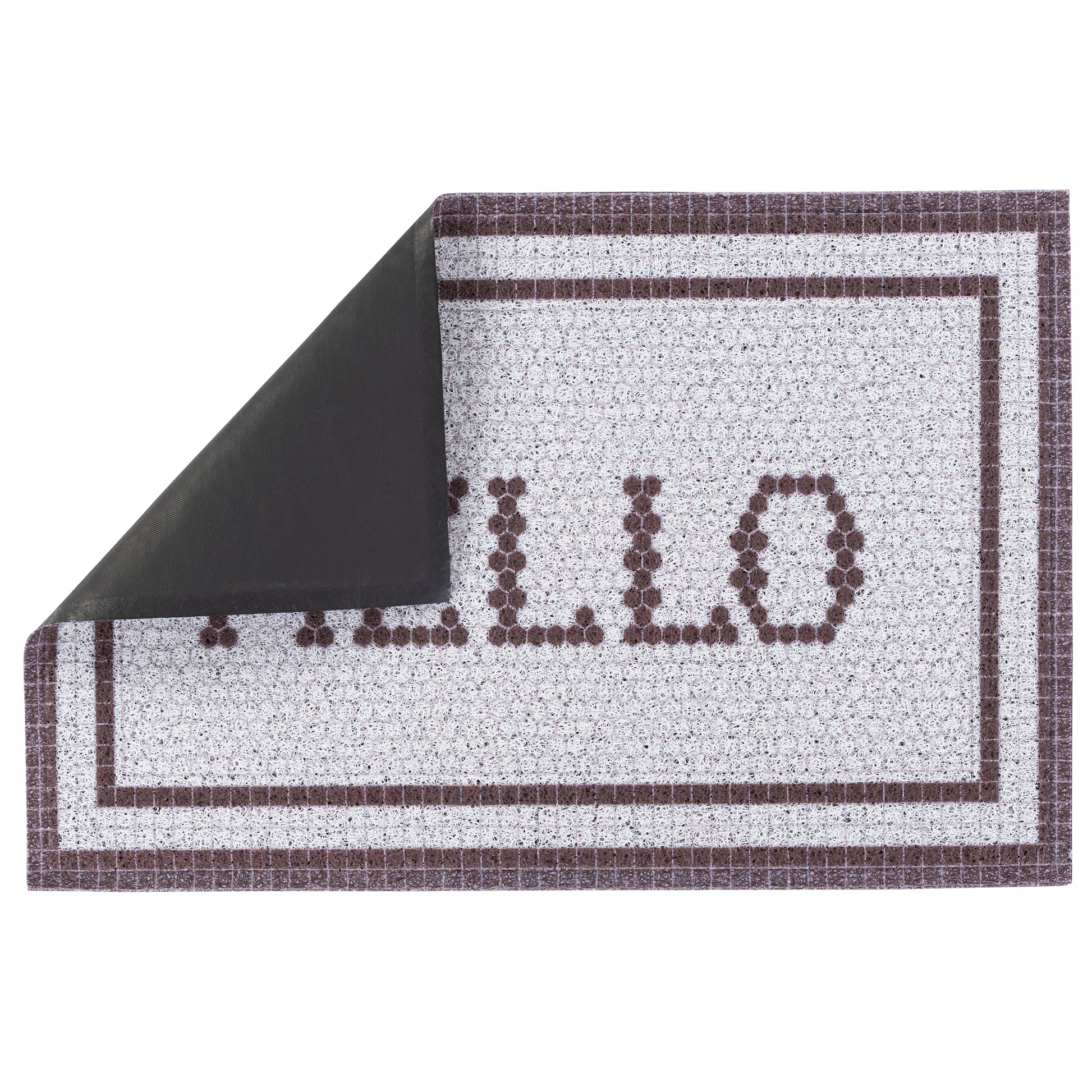 Our Matologie Easy Clean Indoor-Outdoor Doormat effortlessly combines style and function. Crafted from recycled materials, this Grey Hello Noodle Doormat features a subtle light grey background with a Hello Text design with deep brown double border, adding simplicity to any entryway.