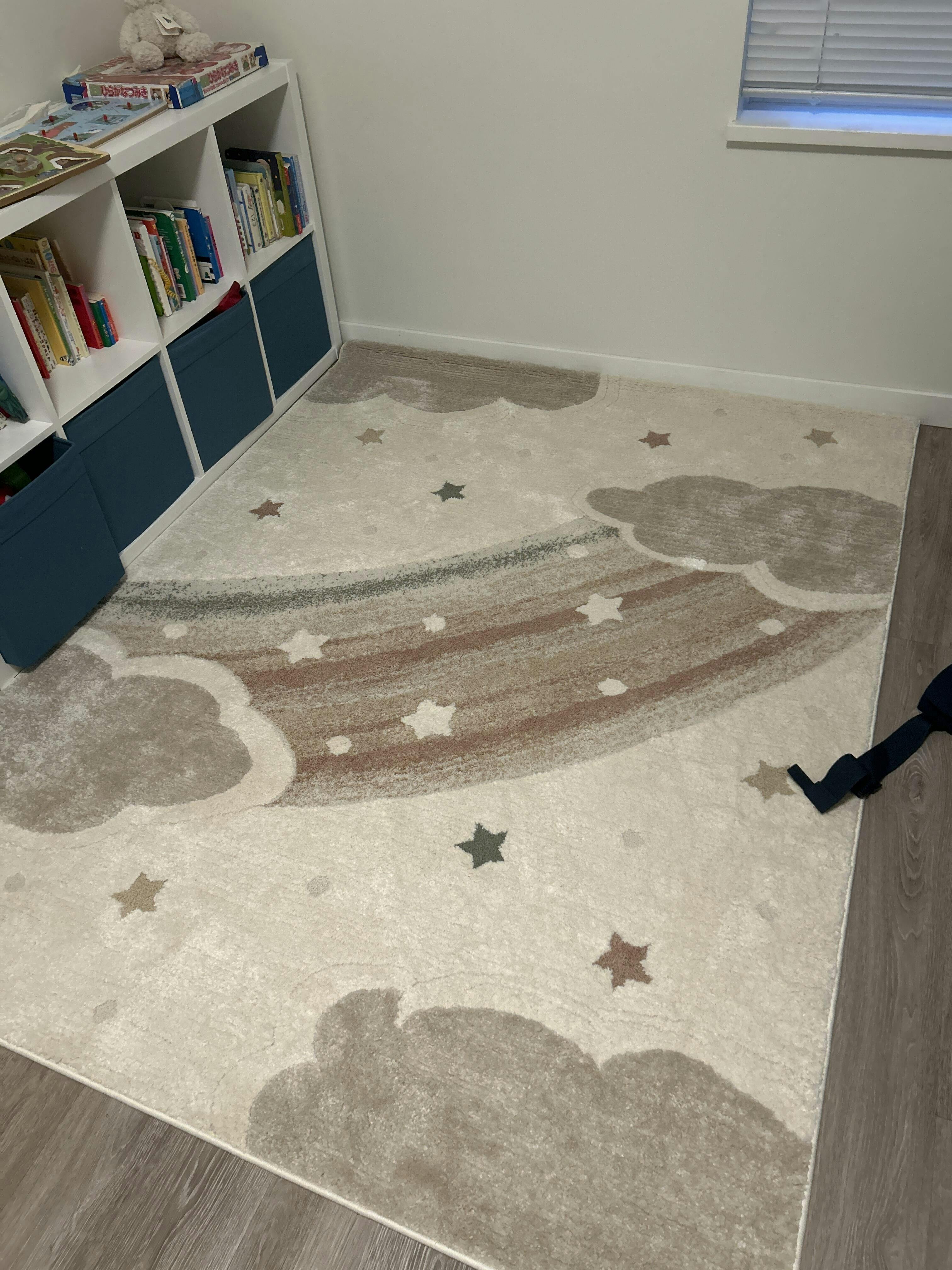 Erbanica Kids Soft Indoor Rug is a beautiful addition to any playroom, nursery or children's bedroom. Featuring cute rainbow with stars and clouds in pretty pastel colors, this elegant rug offers a cozy space for little ones to play and explore.